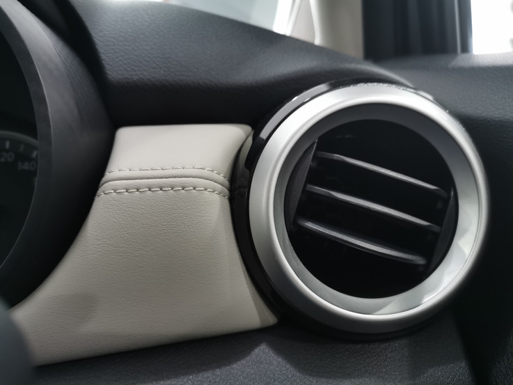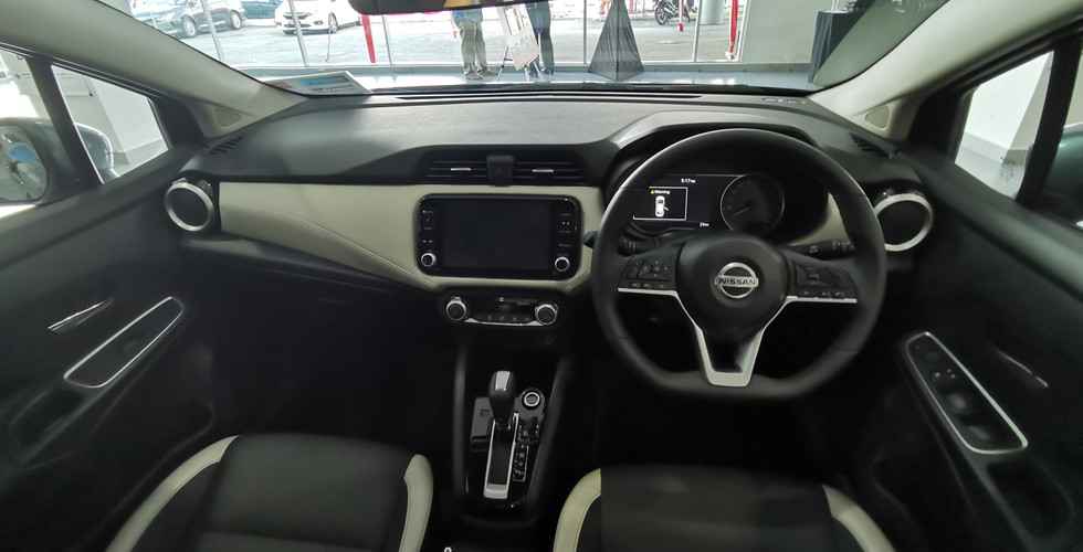 中控:内装终于脱离了上一代的臃肿廉价的趣味,中阶和高阶版添加了马来西亚市场罕见的配色也就是-米色。 座椅也采用了双色的配色,看了几十年的全黑内装,这黑米色的内装搭配为我们的视觉带来了新鲜感。另外,中控上的皮质是软软的一层皮。方向盘延续了上一代后期改款的平底方向盘,这个方向盘可是现在日产全车系都在使用呢! 方向盘摸起来并不会割手,三点钟,六点钟的方向都兼顾了手指的体感和工体学。 手指轻轻握着方向盘,手指是可以贴合地倚靠在方向盘,并且还可以准确地操作各种按键。VLP 和 VLT的方向盘是由真皮包裹,手感更上档次。很遗憾的是档把没有真皮包裹,只做了类碳纤维的处理,稍微为阳春的质感扳回一局。 内装的比例也有点奇怪,屏幕做得特别大,空调的出风口也特别大.